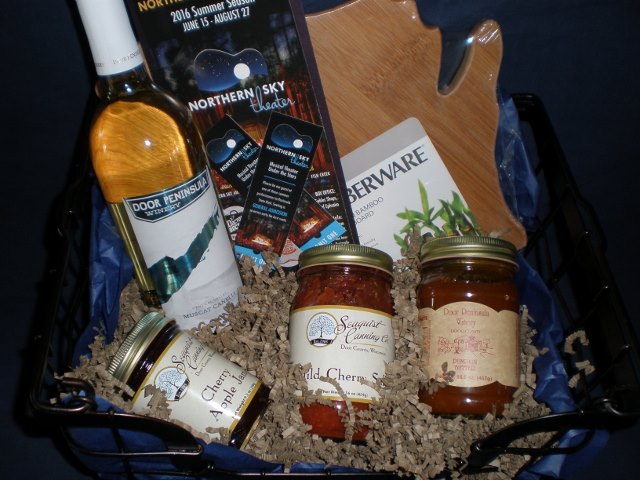 Inside this carbon steel basket you will find some of Door County's finest treasures................2 adult general admission tickets to a 2017 summer show at Peninsula State Park, mild cherry salsa, bottle of Door Peninsula wine, cherry apple jam, pumpkin butter, and a Wisconsin bamboo cutting board.