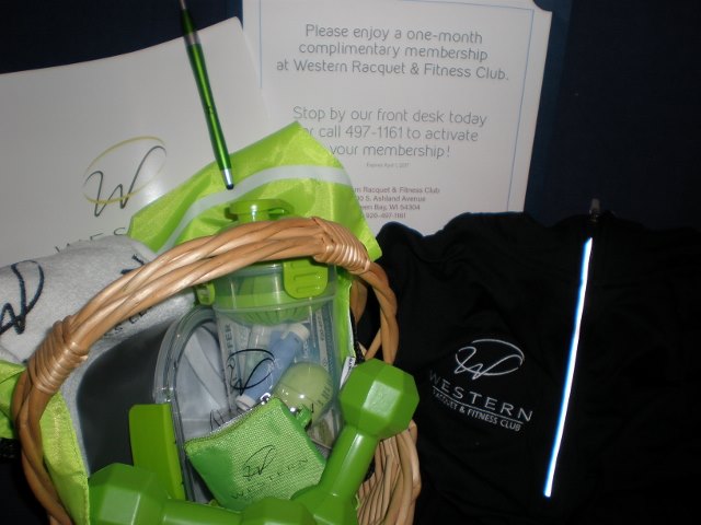 One Month Membership Certificate plus a Nike DriFit Women's Size L stretch athletic zip shirt and hat, hot/cold divided lunch container, stress dumbbells, lip balms, juicer/shaker, towel, tennis ball shaped string bag, keychain bag with earphones, pen/stylus and more.