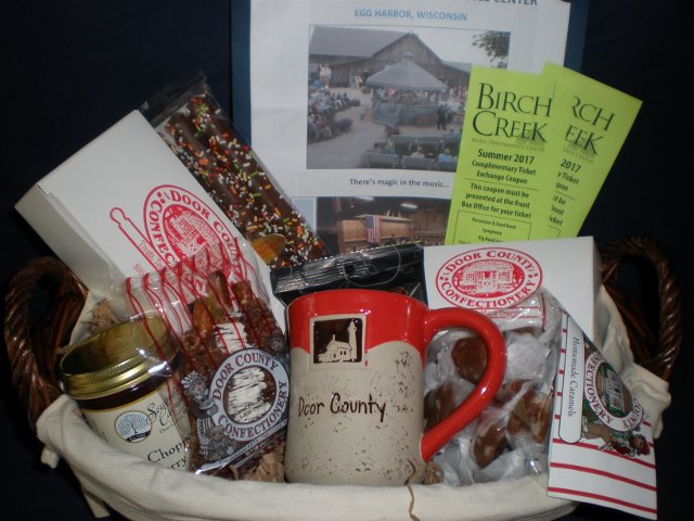 This basket includes some of Door County's favorites: tickets for 2 to any summer 2017 concert at Birch Creek Music Performance Center (visit www.birchcreek.org for concert schedule), chocolates/candy, coffee mug and packet of coffee.