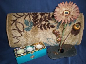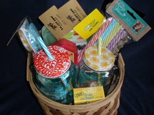 Set of Mason jar drinking glasses with decorative lids and matching straws, salad freezer tray, candle, plus gift cards to Subway ($10) and Smart Cow ($10)!