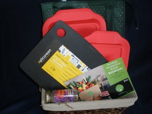 Two covered rectangle Pyrex cake pans, Epicurean Cutting board, Penzey's World's Best Pepper, $40 toward your first purchase of HelloFresh home-delivered meal ingredients and an insulated grocery tote